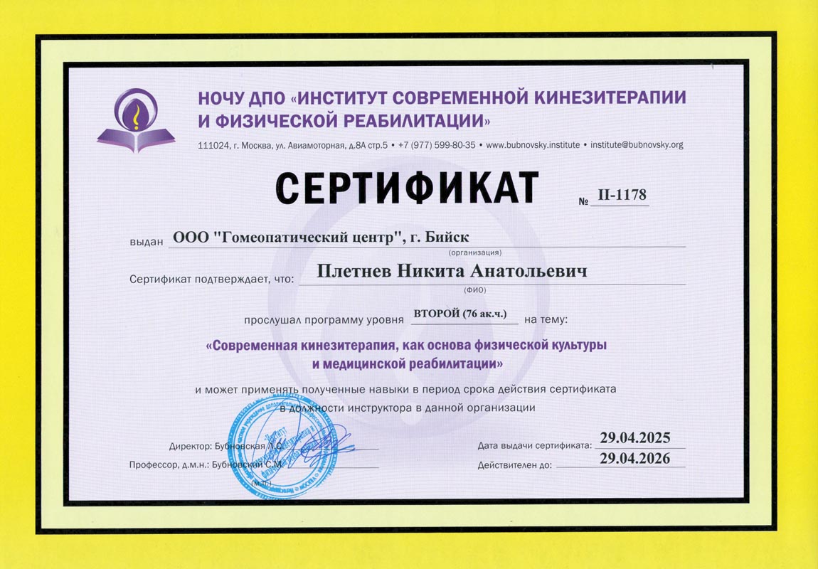 Сертификат обучения методике Бубновского. Номер сертификата: II-1178 от 29.04.2025 г.