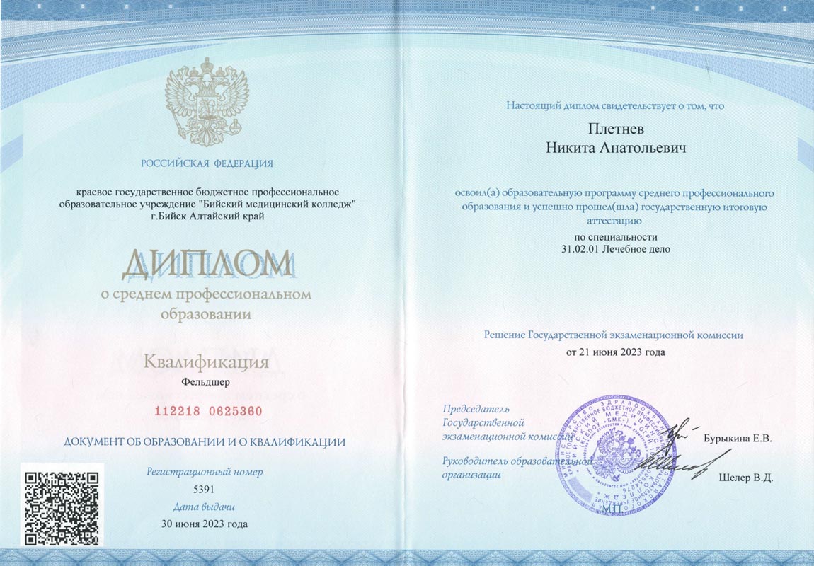 Диплом о среднем профессиональном образовании по специальности "Лечебное дело", квалификация "Фельдшер"