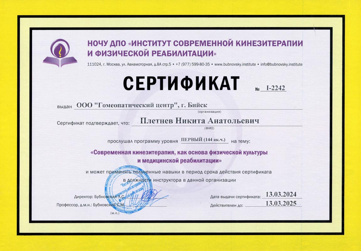 Сертификат обучения методике Бубновского. Номер сертификата: I-2242 от 13.03.2024 г.
