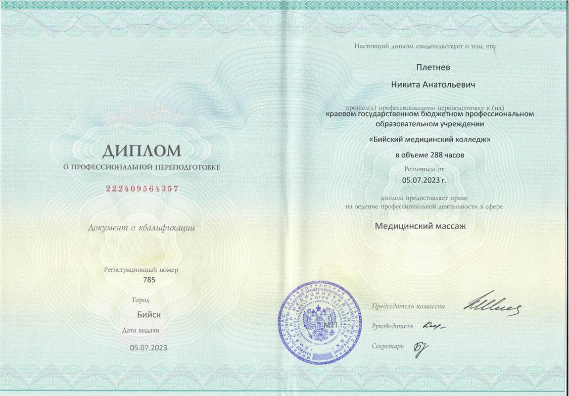 Диплом о профессиональной переподготовке "Медицинский массаж"