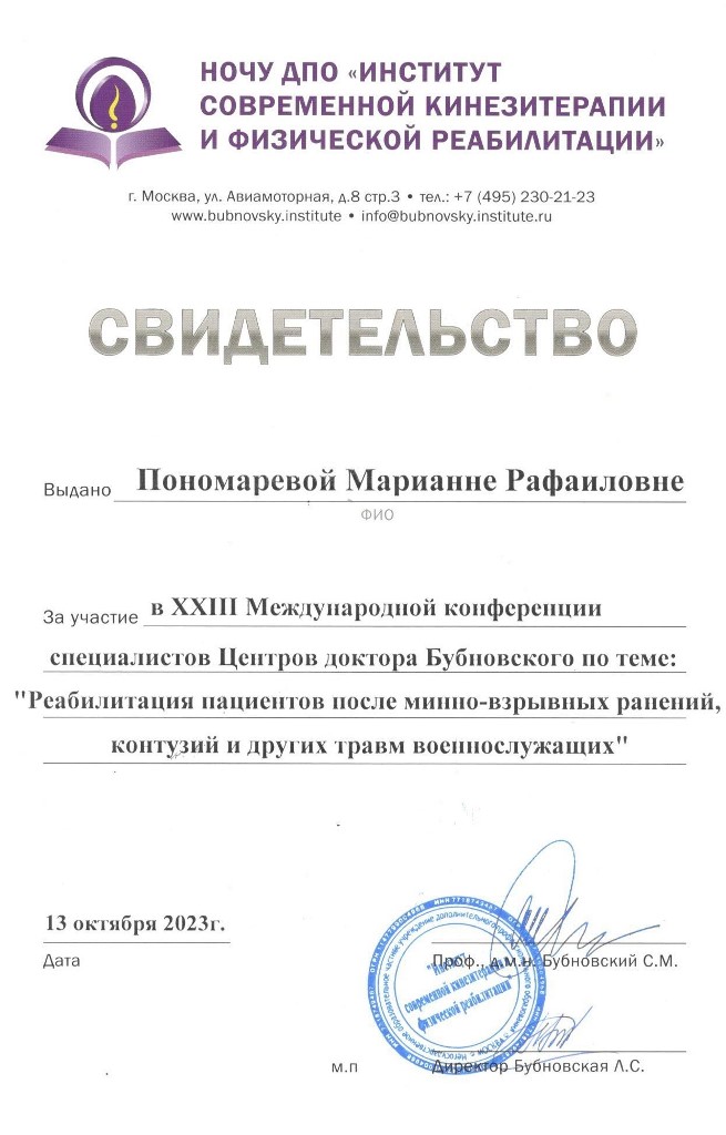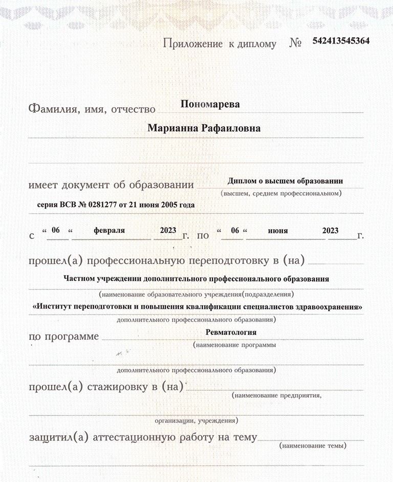 В 2006 году закончила интернатуру по специальности «Педиатрия». В 2019 году прошла профессиональную переподготовку в ООО «Центр специализированного образования «Проф-Ресурс» (г. Рязань) по специальности «Лечебная физкультура и спортивная медицина». В 2020 году обучилась в «Институте современной кинезитерапии и физической реабилитации» по программе «Современная кинезитерапия, как основа физической культуры и медицинской реабилитации». Постоянно повышает свои профессиональные знания и навыки по специальностям «лечебная физкультура и спортивная медицина» и «кинезитерапия».