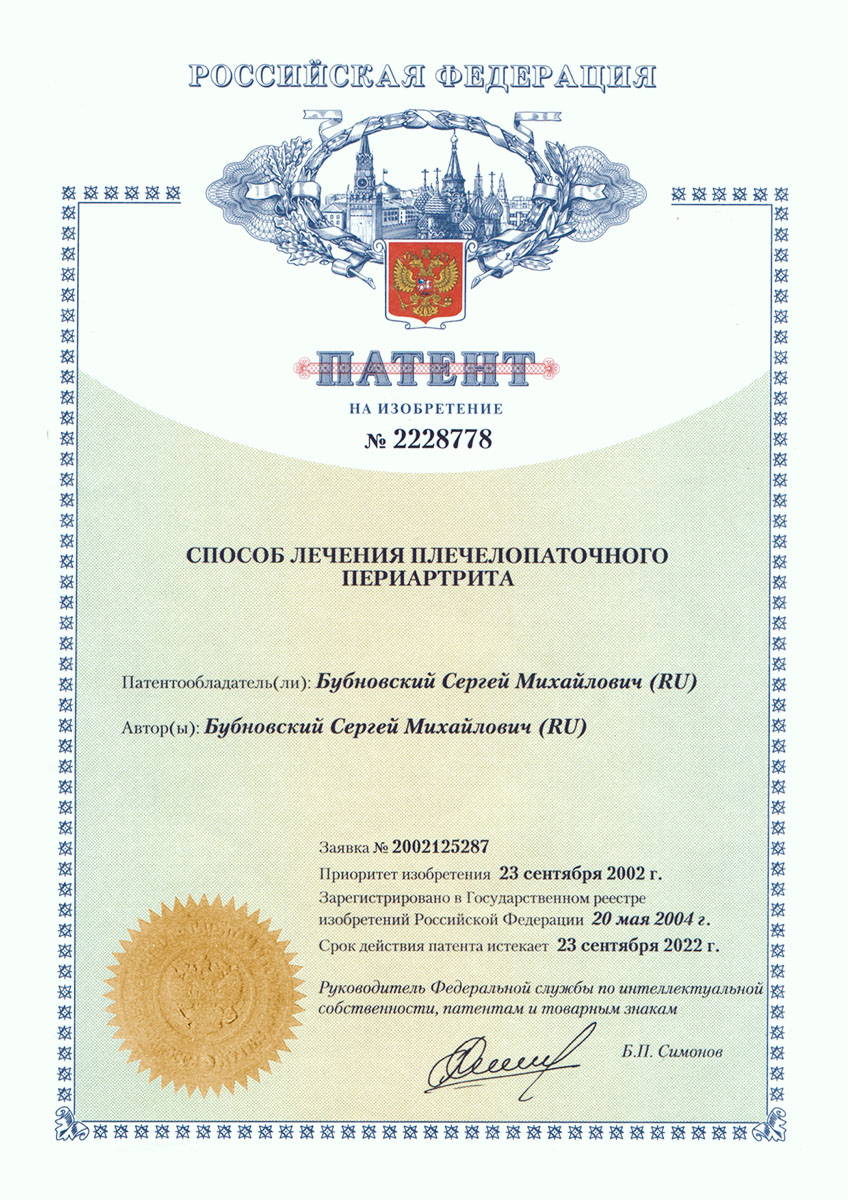 Патент на изобретение. Способ лечения плечелопаточного периартрита