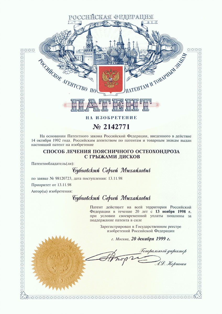 Патент на изобретение. Способ лечения поясничного остеохондроза с грыжами дисков