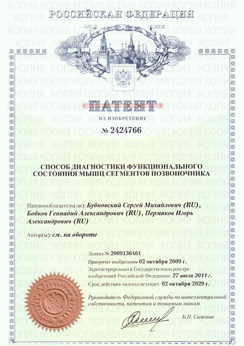 Патент на изобретение. Способ диагностики функционального состояния мышц сегментов позвоночника