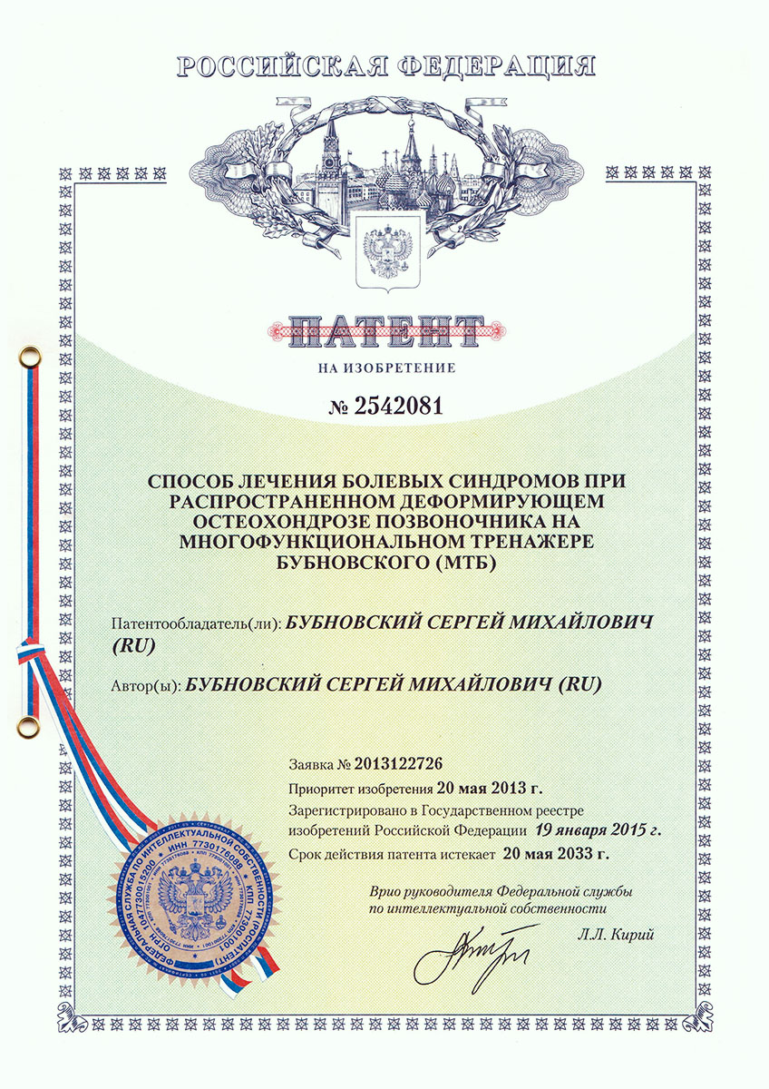 Патент на изобретение.Способ лечения болевых синдромов при распространенном деформирующем остеохондрозе позвоночника на многофункциональном тренажере Бубновского (МТБ)