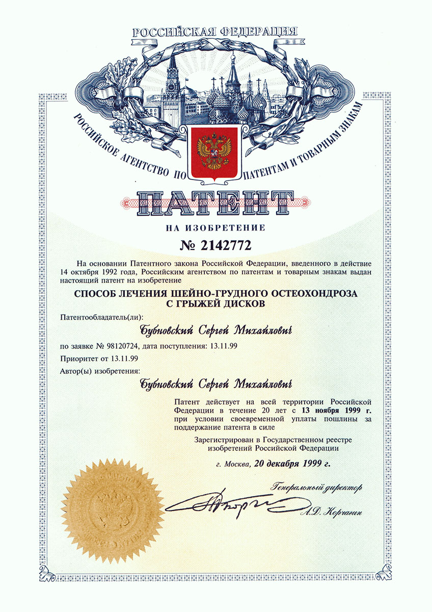 Патент на изобретение. Способ лечения шейно-грудного остеохондроза с грыжей дисков